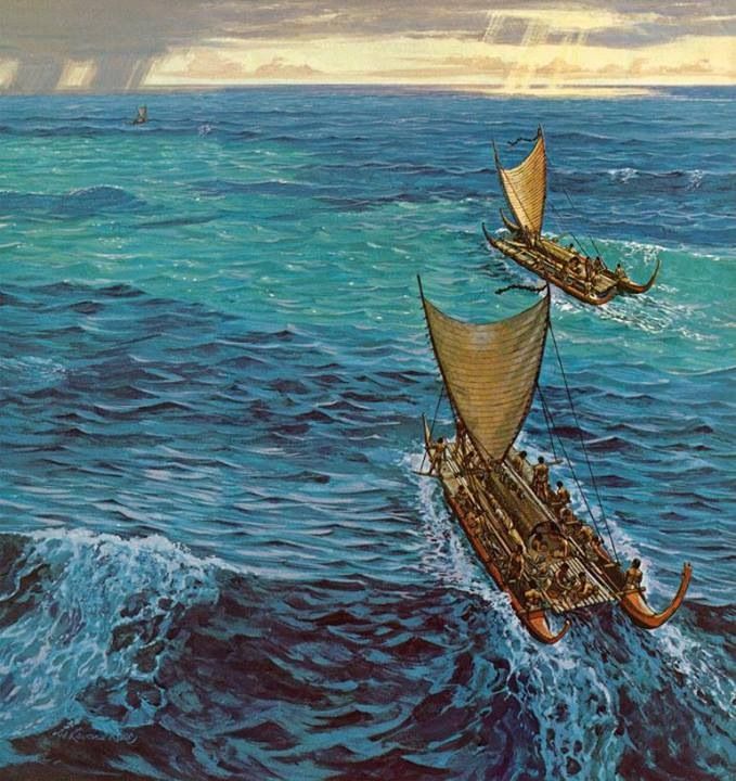At least a century before the Europeans made landfall in the Americas, Polynesians were actively engaged in trade with various peoples in South America and North America, introducing the locals to chicken and returning to Polynesia with sweet potatoes. They voyaged out of sight of land for weeks at a time, navigating thousands and thousands of miles of open ocean without a compass or chronometer, using their encyclopedic knowledge of the sun, the moon, the and the stars, tides, winds, currents, clouds, and ocean swells, animal migration,  weather patterns, and changes in the color of the sea. It is said that a Polynesian navigator could tell by the shape of a mid-ocean wave whether or not it had crested an island in the past 2 weeks.